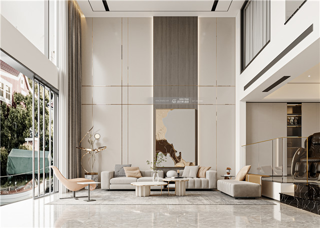 挑高的大理石電視背景墻,搭配簡約白色,讓家呈現高級的空間感受,明亮的高大的落地窗,讓原本就開闊的空間變得更加通透。純凈的空間和大氣的設計語言讓家呈現高級品質感格調。
