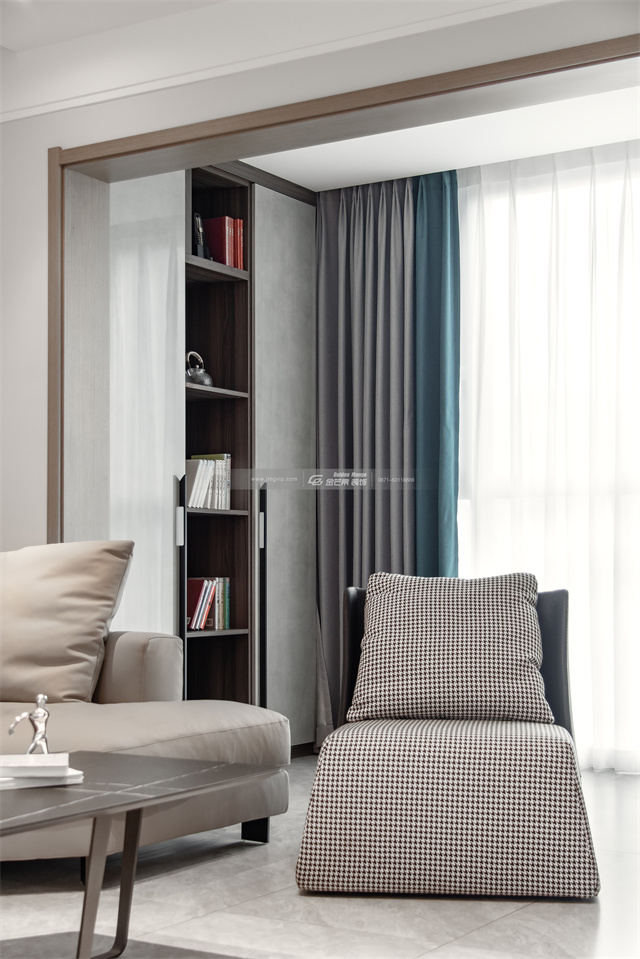 書房,原本戶型是一個不規(guī)則的地方,通過設計師的改造利用后變成了獨有的造型,柜子兩邊做了隔而不斷的展示柜既增強了書房的采光通風性能又增強了與客廳的通透性。