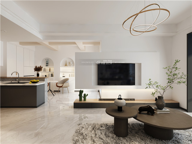 簡約的白色墻體,符合當下大多數人的家具理念,獨特的電視背景墻,展現空間溫暖可愛的氛圍。溫暖細膩的木質茶幾,傳遞濃濃的安全感,溫馨的地毯,讓家變得更加的溫暖。