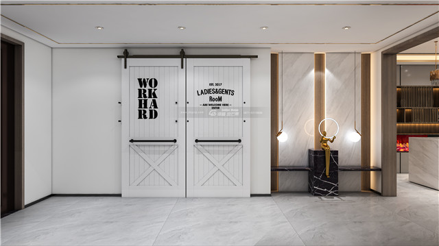 運用的是相對清新的顏色,簡潔的大理石書桌,灰粉色辦公椅,精細的線條,讓空間變得精致韻味十足?;也:烷L虹玻璃,營造隱約的光影效果,高級感滿溢。