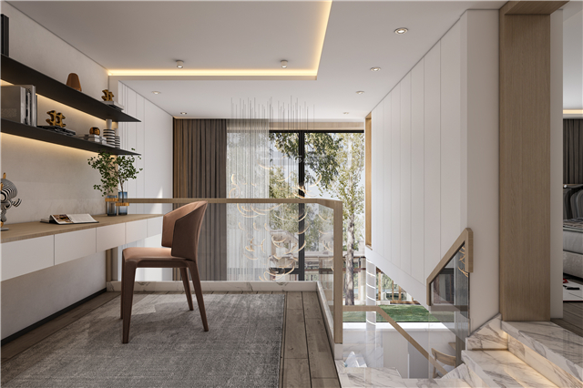 透明的玻璃扶手,簡約的設計開辟出一塊閱讀休閑的小天地,溫馨又甜美的配色讓書房空間變得溫暖而精致。