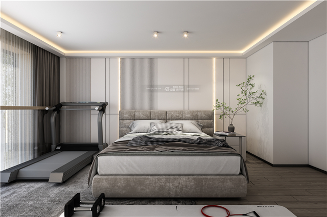 簡約的線條和顏色營造開闊感,床頭背景墻通過線條打造豐富的空間層次。清淺溫柔,愜意舒適。加上玻璃瓶和綠植,更是讓空間多了幾絲靜謐的味道。