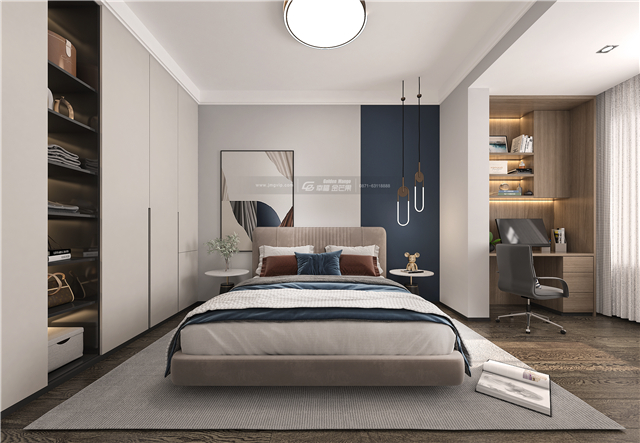 暗藍的配色營造一種高級感空間氛圍,留出一個休閑辦公的區域,增加功能性。木材顏色較深,和暗色墻面結合,形成一種沉穩、安心的空間氛圍。
