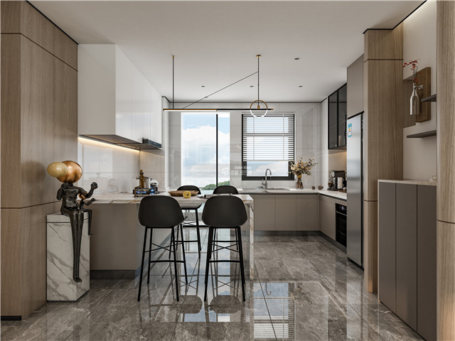 簡(jiǎn)約大方,讓烹飪變得更加自在。百葉簾窗隙將陽光分隔,隱約的光影下氣氛變得溫馨又治愈。小吧臺(tái)功能性強(qiáng)的同時(shí)增加空間情調(diào)。
