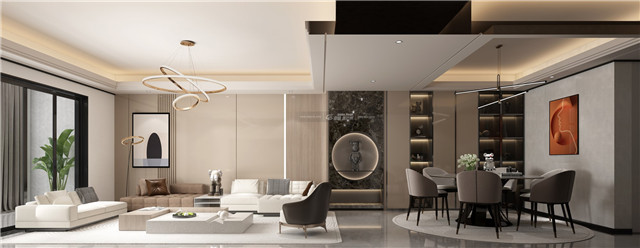 整體是優雅又高級的顏色,和光影搭配起來,展現低調的華麗感。顏色優雅,質感高級的餐桌椅把空間檔次提升起來。硬包的沙發背景墻看起來質感滿滿。客廳和餐廳以黑色大理石作為空間區隔,一切都是在營造輕奢的華麗感。