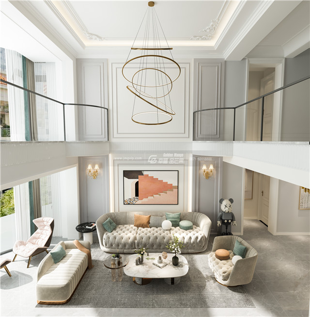 整體空間以白色為基調,讓原本就寬闊的空間更加通透。客廳做挑高設計,展現別墅大宅的專屬優勢,墻上用石膏線做雕花的設計,展現低調的奢華感。灰色地磚,通透而自由,展現高級感。
