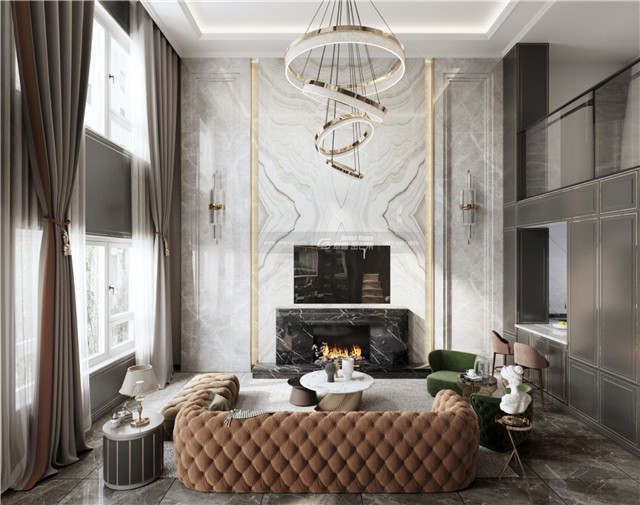 挑高的電視背景墻用大理石做背景,簡約時尚,氣度非凡。一盞華麗的燈飾更將空間的氣度拉升。電子壁爐升起溫暖的火焰,橘色沙發、綠色單椅將空間溫暖的氛圍承托得恰到好處。