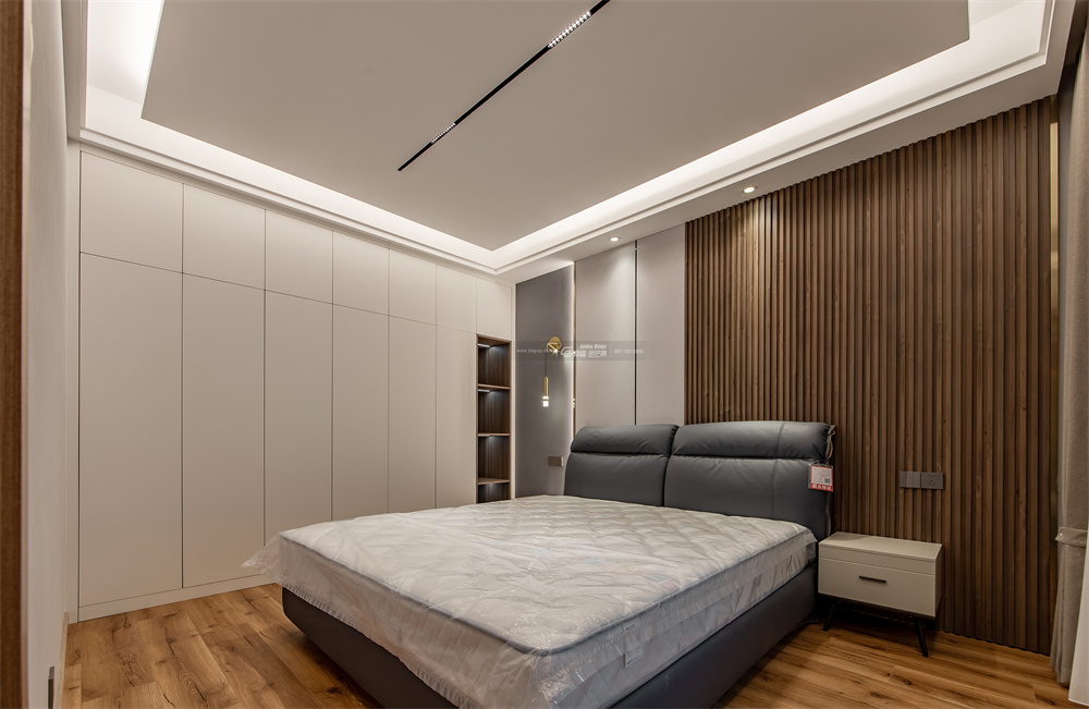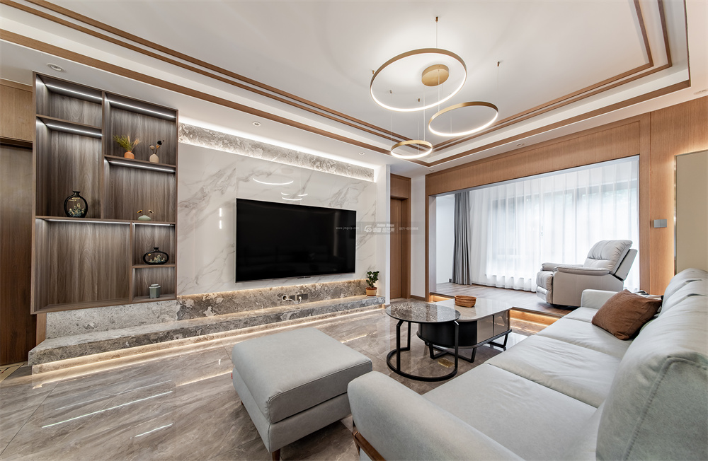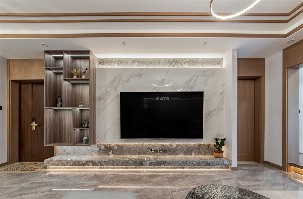 摒棄傳統的電視柜造型,用大理石加燈帶的處理,護墻板后安裝燈帶,相互輝映打造優美的光影效果。是打動人心的溫暖,是別具一格的華麗。