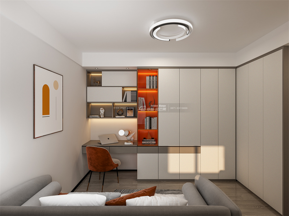 榻榻米做半屋布局,柜體書桌做一體化設(shè)計(jì),大大提升空間利用率,并做了開放格設(shè)計(jì),方便日常物品和精美飾品的擺放,內(nèi)嵌式燈帶讓光線更柔和,讓空間顯得更溫柔。