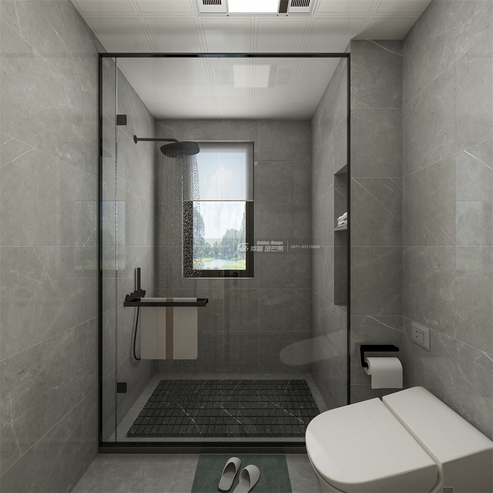 衛(wèi)生間以灰色瓷磚為主,顯得整體簡約大氣又有質(zhì)感。沐浴區(qū)采用玻璃隔斷做干濕分離,視覺效果很通透。