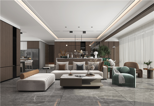 整體冷靜、安靜自在的氣質,井然有序的空間節奏,撫平煩躁的心緒,心思也變得有條理了起來。采用灰色地磚和大面積木飾面設計,空間變得沉靜而富有文藝高級的氣質。簡約的線條設計,加上大理石的點綴,絲絨材質的抱枕,整體空間奢華而沉靜內斂。