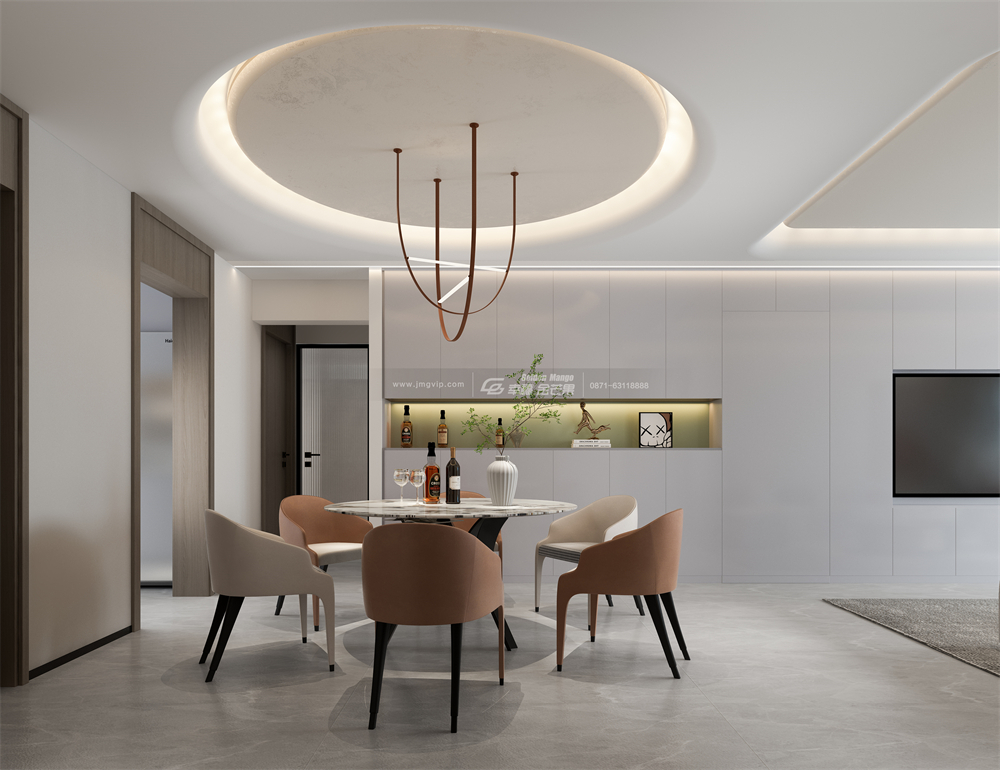 硬裝設計上將吊頂設計為方形和圓形,仔細觀察不難發現,它們正好對應下空的長方形地毯與圓形餐桌,上下巧妙呼應充滿設計感。線性燈搭配上吊頂,打造出懸浮效果,延伸空間視覺,不壓層高,營造出高級又溫馨的氛圍感。
