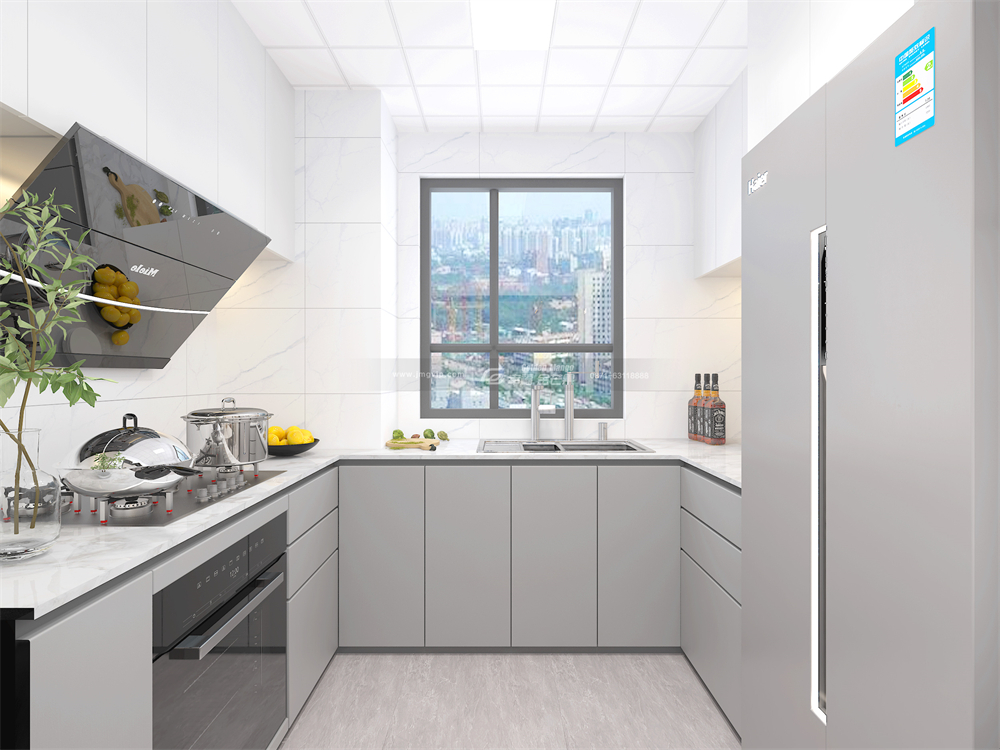 為了讓廚房清清爽爽,整個廚房空間選用了清新自然的白色與灰色,外觀簡潔不占空間,整體高級又簡約便利。還定制了透明推拉門,再也不用擔心油煙亂跑啦!
