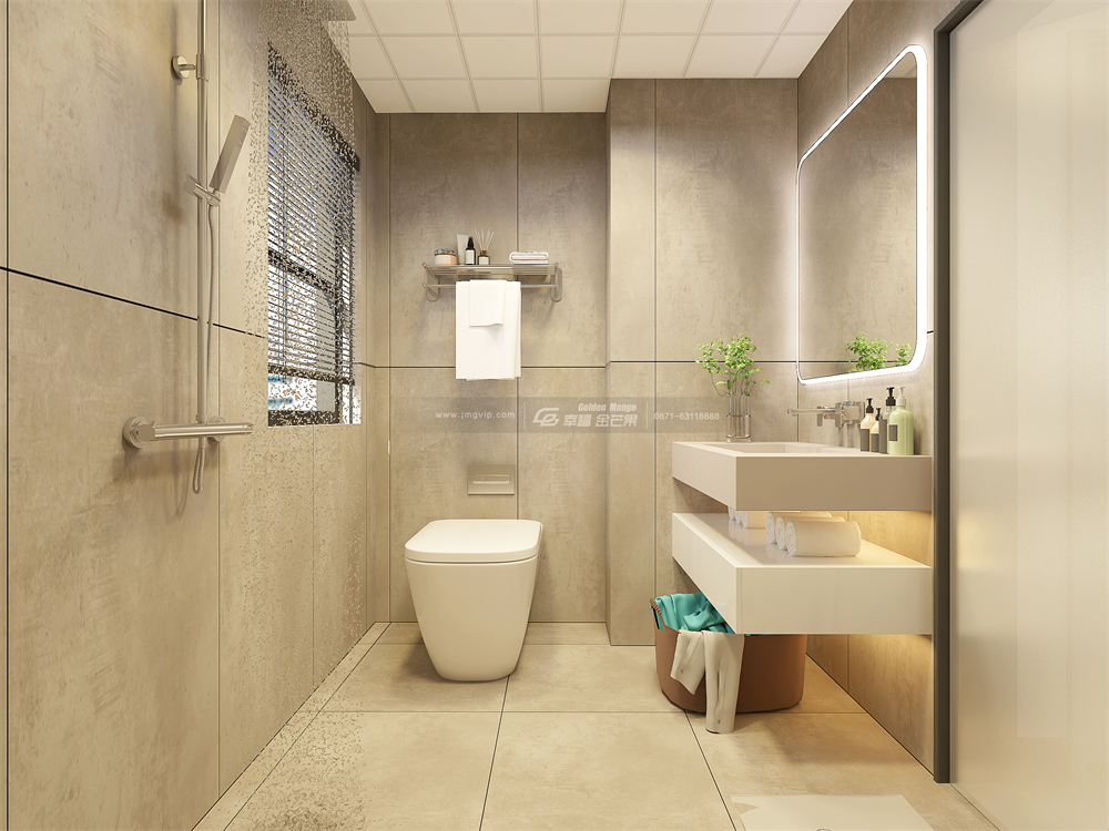 浴室鏡加入燈帶后,氛圍感滿滿,下方設計懸空浴室柜,既能避免水汽對柜體的傷害,造型上也顯得空間更加簡約。