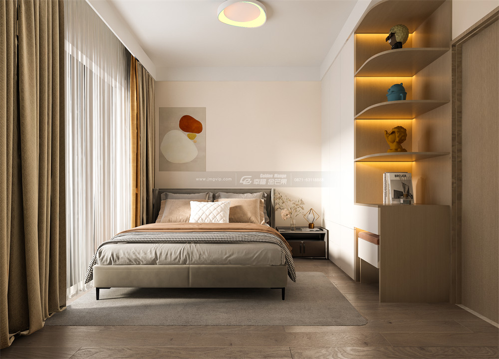 次臥柜體沿著墻面定制,一墻到頂,還設(shè)計(jì)了弧形的開放格,放上喜歡的書籍或擺件,別有一番韻味,靜謐又美好,實(shí)用性也高!