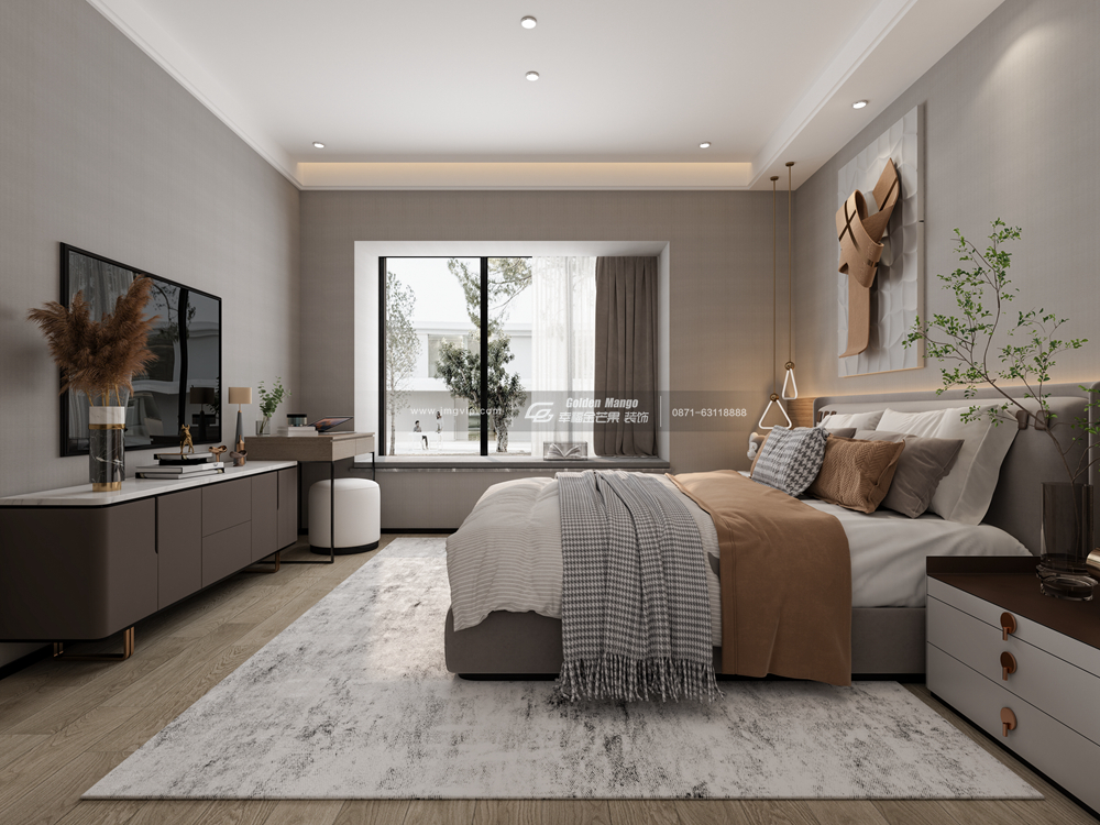 次臥降低了主臥的色調感,整體采用淺棕色和淡灰色營造空間舒適淡樸的氛圍,更加有助于睡眠和緩解疲勞;放棄傳統吸頂吊燈設計采用無主燈設計,以小射燈、燈帶和壁燈營造溫馨舒適的感覺,整個空間設計更顯精致氛圍。