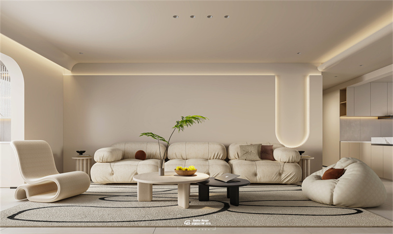 客廳沙發(fā)消失術(shù),沙發(fā)的顏色與背景融為一體,使整個(gè)空間更加地輕盈與放松。用曲線將軟糯的溫柔質(zhì)感盡情揮灑,展示著優(yōu)雅且恬靜的魅力。