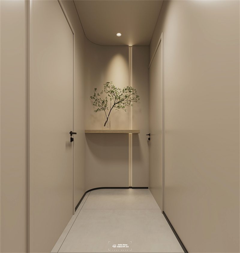 玄關(guān)處用流暢的曲線一筆鋪敘,統(tǒng)一的色彩運(yùn)用像一幅畫(huà)作緩緩鋪開(kāi)來(lái),鋪墊著即將要進(jìn)入房間的溫柔情緒。