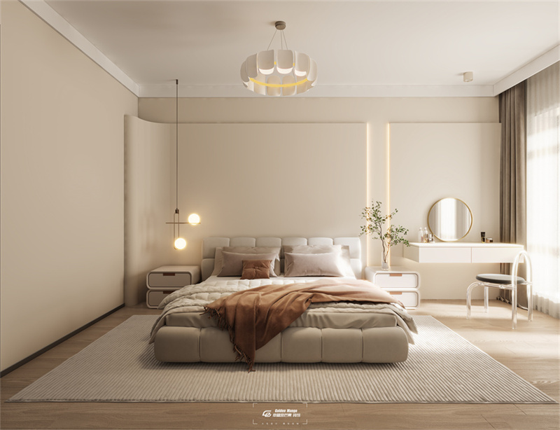 主臥依然延續(xù)客餐廳的奶油色,整個(gè)空間靜謐而細(xì)膩。