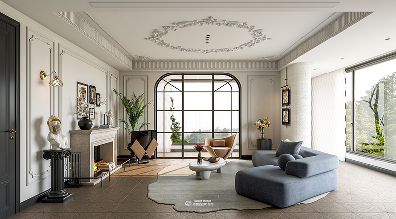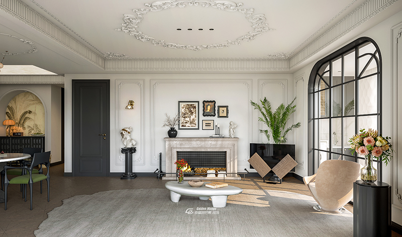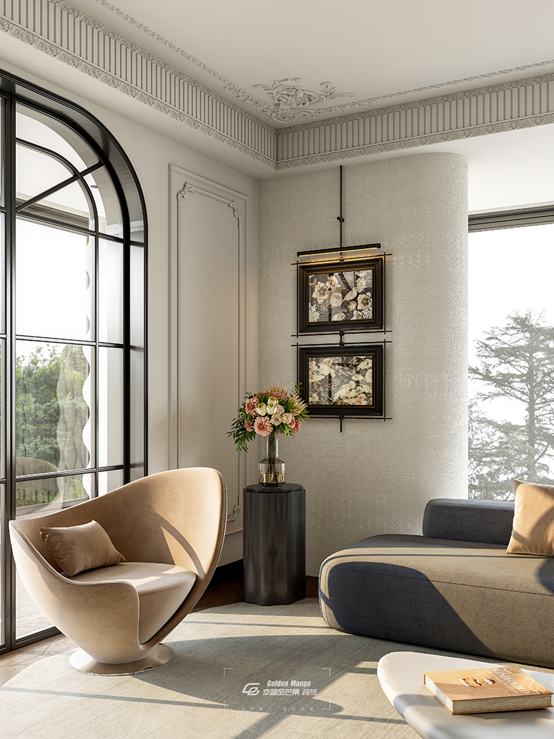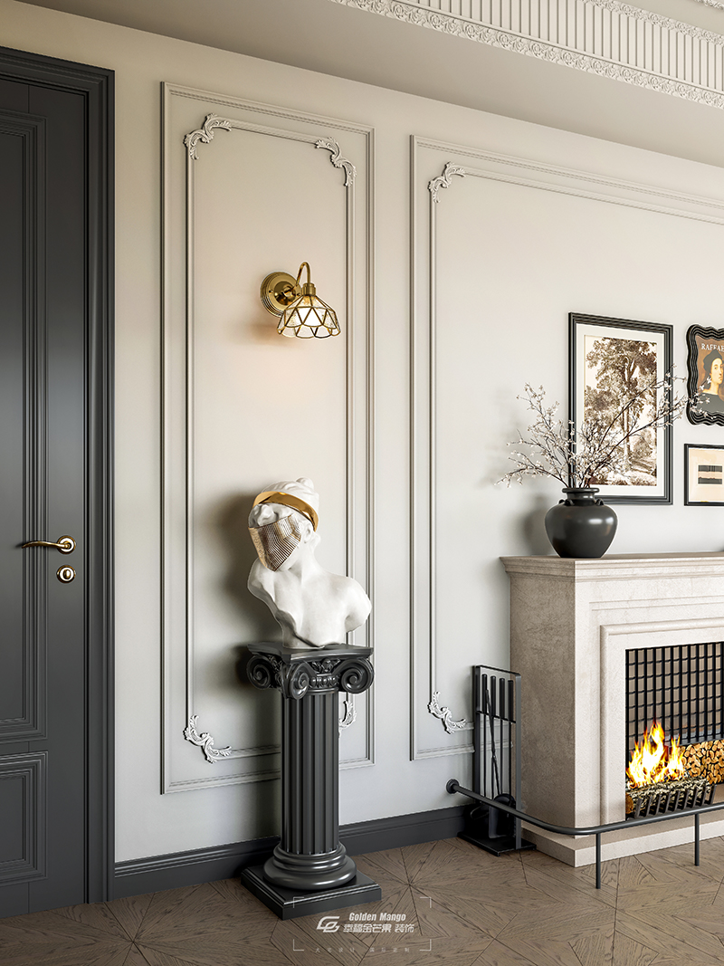 沙發后方的古典風格壁畫,以細膩筆觸描繪著自然景致,瞬間拉滿藝術氛圍。墻面造型線條簡潔而富有韻律,勾勒出空間的層次感,盡現美式風骨。