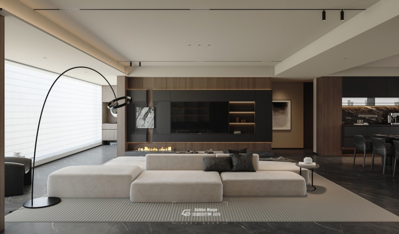 踏入客廳,便被其通透開闊的格局所震撼。墻面以黑、白、木三色為主基調(diào),通過簡潔的線條與色塊劃分,勾勒出極具現(xiàn)代感的視覺效果。