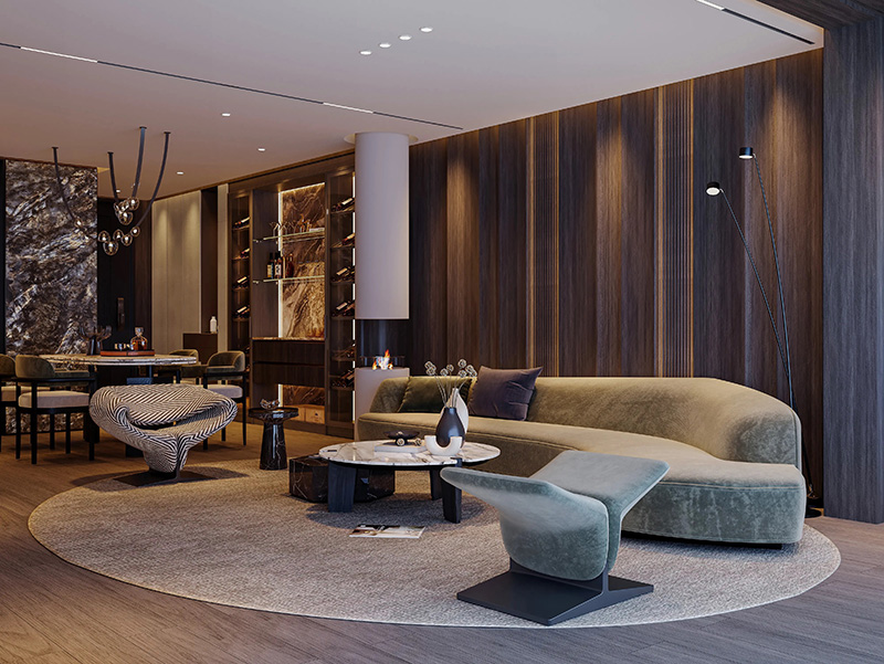 觸感的溫度:全屋通鋪煙熏橡木地板,絨面弧形沙發(fā)與羊毛地毯柔軟包裹,中和深色基調(diào)的冷峻,詮釋“少即是奢”的哲學(xué)——每一寸材質(zhì)都經(jīng)得起指尖的摩挲與時(shí)光的考驗(yàn)。