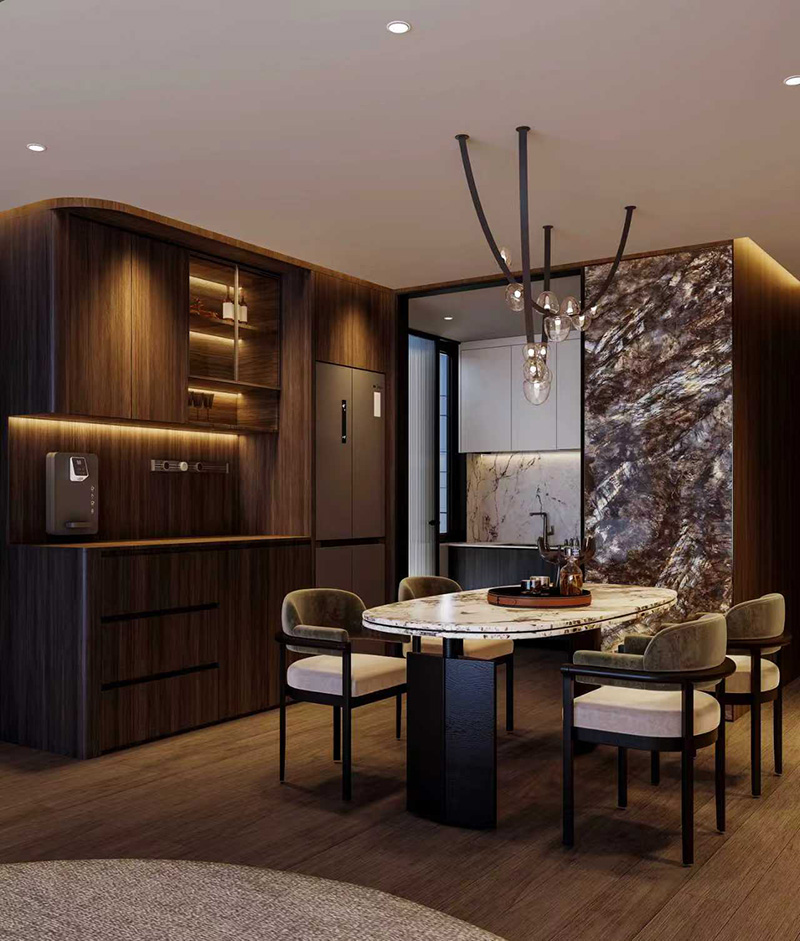 石材與木質(zhì)的對(duì)話:客廳以天然大理石背景墻為視覺焦點(diǎn),紋理如潑墨山水般恣意流淌,搭配深色木飾面定制柜體,理性與藝術(shù)在此碰撞。餐廳延續(xù)這一脈絡(luò),巖板島臺(tái)與胡桃木餐桌組合,溫潤(rùn)中透出克制的華麗。