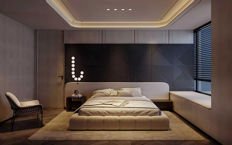 幾何心機(jī):臥室背景墻暗藏不對(duì)稱幾何分割,搭配嵌入式2700K射燈,光影在墻面繪出抽象畫作,細(xì)節(jié)處見大師手筆。
