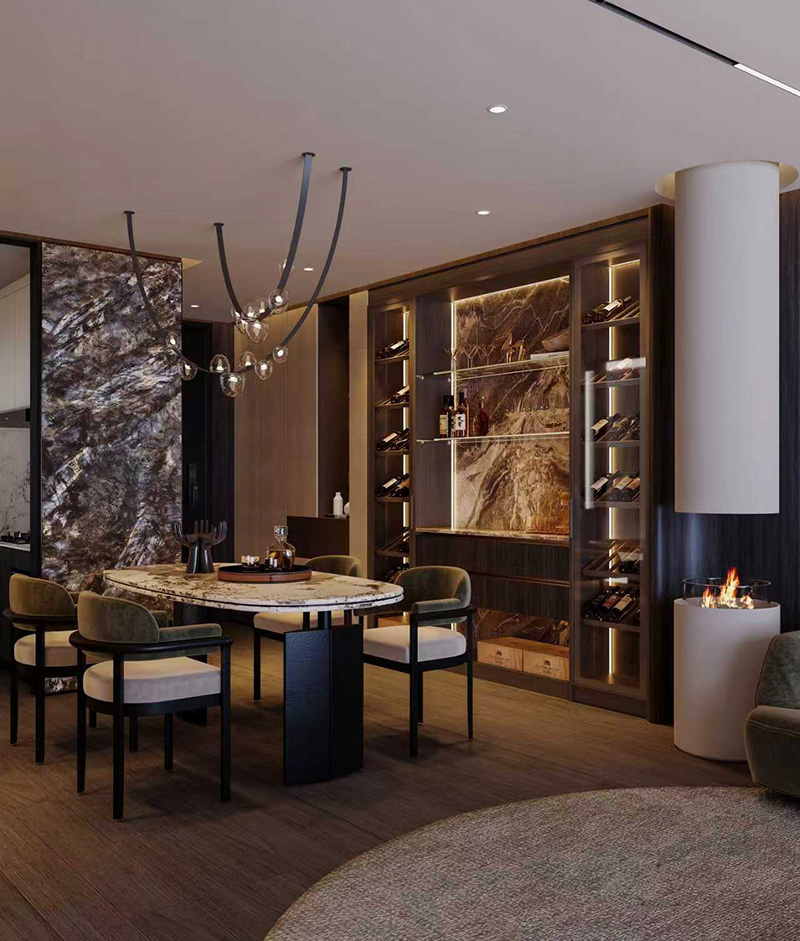 靜奢風(fēng)格的靈魂在于材質(zhì)的純粹表達(dá)。畫面中央,不規(guī)則大理石紋理的背景墻如山水畫卷般鋪展,深棕與米白的自然肌理在嵌入式暖光的映照下,呈現(xiàn)出玉石般的溫潤(rùn)光澤。與之形成材質(zhì)對(duì)話的是深色胡桃木酒柜,豎條紋的木飾面通過精密的拼接工藝,在視覺上延伸了空間高度,內(nèi)置的感應(yīng)式層板燈將珍藏的酒品輪廓勾勒得如同藝術(shù)展品。