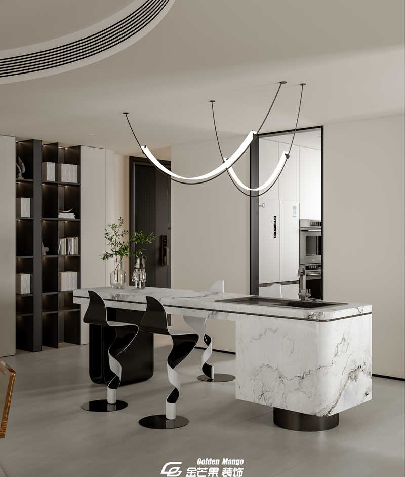 n 從客廳步入餐廳,視野豁然開朗。金芒果的設計師將餐廳與廚房打通,用一個中島臺作為自然過渡,既增強了家人間的互動,又讓空間顯得更加通透。餐桌的選擇堪稱點睛之筆—— 一張長度 2.2 米的巖板餐桌,搭配 6 把淺灰色皮質餐椅,簡約中透著高級感。餐桌上方懸掛著一盞造型獨特的吊燈,黑色金屬框架搭配白色燈罩,燈光灑下時,給食物鍍上了一層溫柔的濾鏡。