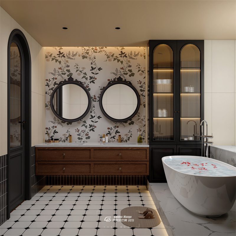 以米色為主調,搭配花卉壁紙增添浪漫。拱門、雕花鏡、木質臺盆柜融入經典元素,玻璃收納柜帶燈光設計,實用又美觀。黑白花磚、獨立浴缸,營造出優雅精致且具儀式感的洗漱沐浴場景 。