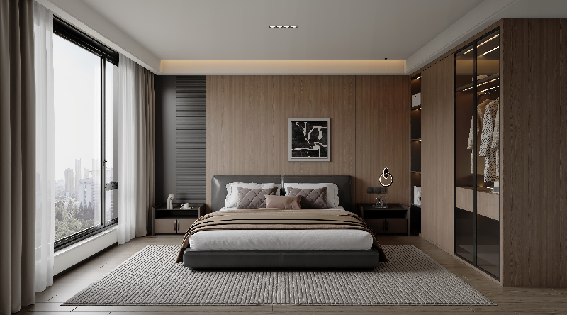 移步至臥室,宛如踏入了專屬的靜謐私域。木飾面的床頭背景墻,結合柔和的燈光設計,帶來自然與溫馨的雙重體驗。