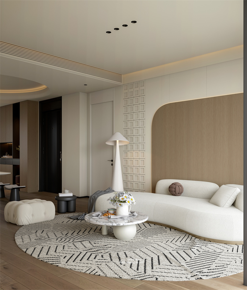 空間以 “淺色系 + 木質肌理” 為基底,弱化了現代風格的冷硬,多了份松弛親和:造型圓潤的白色沙發像一朵 “云”,慵懶地承接生活的閑逸;黑白紋理的圓形地毯如藝術畫布,為空間錨定 “隨性又精致” 的基調。