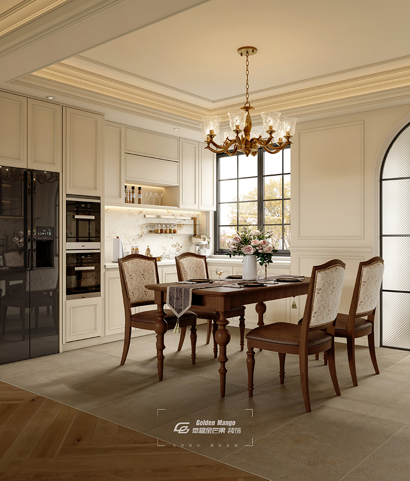 穿過客廳,餐廚區域如同一幅精美的生活畫卷徐徐展開。開放式布局讓空間通透靈動,奶白色櫥柜與金色把手相得益彰,彰顯著生活的精致與儀式感。