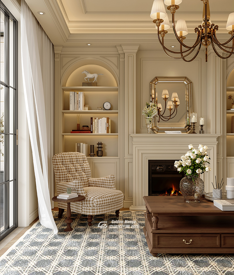客廳宛如一個溫馨的擁抱,奶白色主調搭配天然木紋地板,演繹出柔和與自然的協奏曲。皮質沙發慵懶地倚靠在絨毯之上,與木質茶幾輕聲對話,金屬邊角在燈光下閃爍著微光,仿若訴說著古老的奢華故事。壁爐里跳躍的火苗,不僅溫暖了整個空間,更為靜謐夜晚增添了一抹浪漫氛圍。