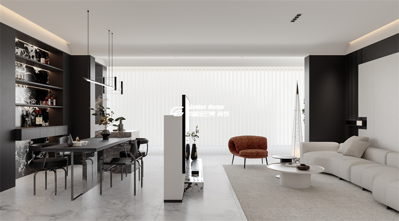 客廳以黑白灰構(gòu)建極簡框架,卻在細節(jié)處暗藏奢雅心機。弧形米白色沙發(fā)柔化空間棱角,搭配焦糖色意式單人椅,在中性色調(diào)中注入溫暖層次。墻面的黑白大理石藝術(shù)裝置與電視背景的極簡設(shè)計形成對比,金屬線條吊燈的幾何感則呼應(yīng)了意式設(shè)計的理性美學(xué)。