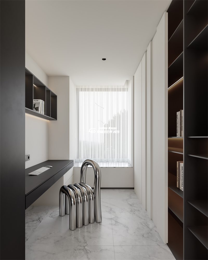 書房以黑白極簡風(fēng)格打造專注空間,卻因一把金屬藝術(shù)感座椅成為視覺焦點。墻面的嵌入式書架與懸浮書桌,滿足收納與辦公的雙重需求;大窗配白紗簾,讓自然光線輕柔地鋪滿空間,營造出 “在藝術(shù)中工作,在工作中沉思” 的意式人文氛圍。