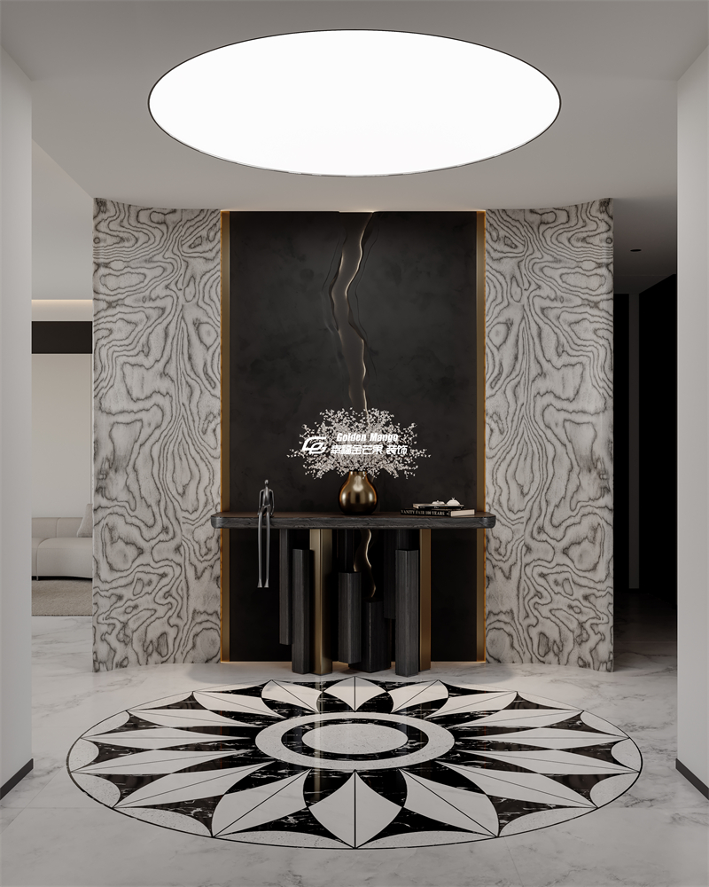 兩側(cè)墻面采用紋理獨特的石材,自然肌理與中間黑色巖板的 “水波紋” 設(shè)計碰撞,搭配金屬線條的精致勾勒,將意式設(shè)計的輕奢感與現(xiàn)代極簡的利落感融為一體。黑色藝術(shù)端景臺上,金屬花瓶與白色花藝的組合,讓入戶瞬間便充滿藝術(shù)氛圍,成為空間的精神錨點。