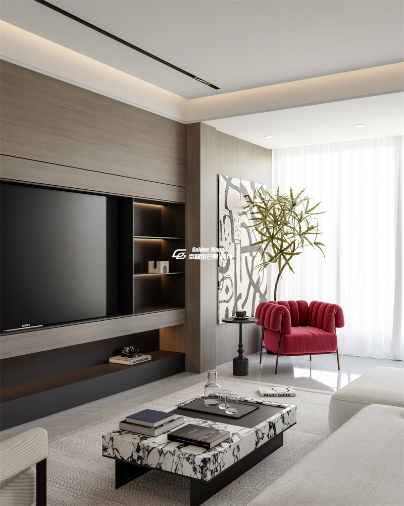 細(xì)節(jié)巧思:電視背景墻的木飾面與黑色收納格形成對(duì)比,暗藏的燈帶為擺件鍍上一層柔光;角落那抹紅色單人椅,是空間的點(diǎn)睛之筆,在理性的極簡中跳脫出一抹熱烈的生活情緒。