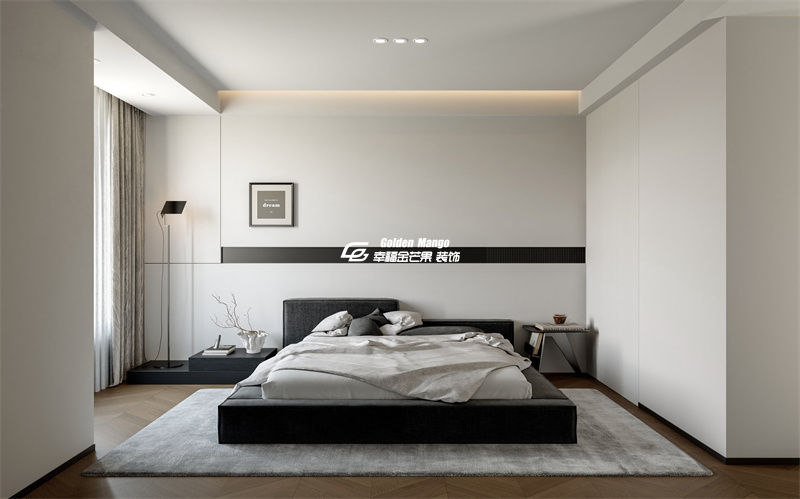 色彩與材質(zhì):黑白灰的經(jīng)典配色冷靜而高級(jí),木質(zhì)地板的溫暖紋理則中和了冷調(diào)的疏離;無主燈設(shè)計(jì)讓光線如自然呼吸般柔和,床頭的極簡掛畫與黑色裝飾條,為空間注入一絲藝術(shù)張力。