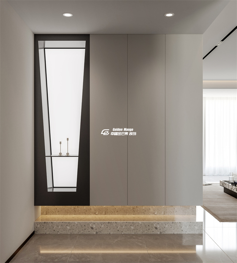 推開家門,玄關(guān)以簡潔的幾何語言拉開生活的序幕。淺灰色柜體與深咖色裝飾框形成視覺對(duì)話,內(nèi)嵌的展示區(qū)陳列著精致擺件,仿佛在輕聲訴說主人的審美意趣。底部石材基座的暖光緩緩流淌,既勾勒出空間層次,又在歸家時(shí)刻送上一份溫柔的暖意,讓每一次進(jìn)門都成為一場小小的儀式。