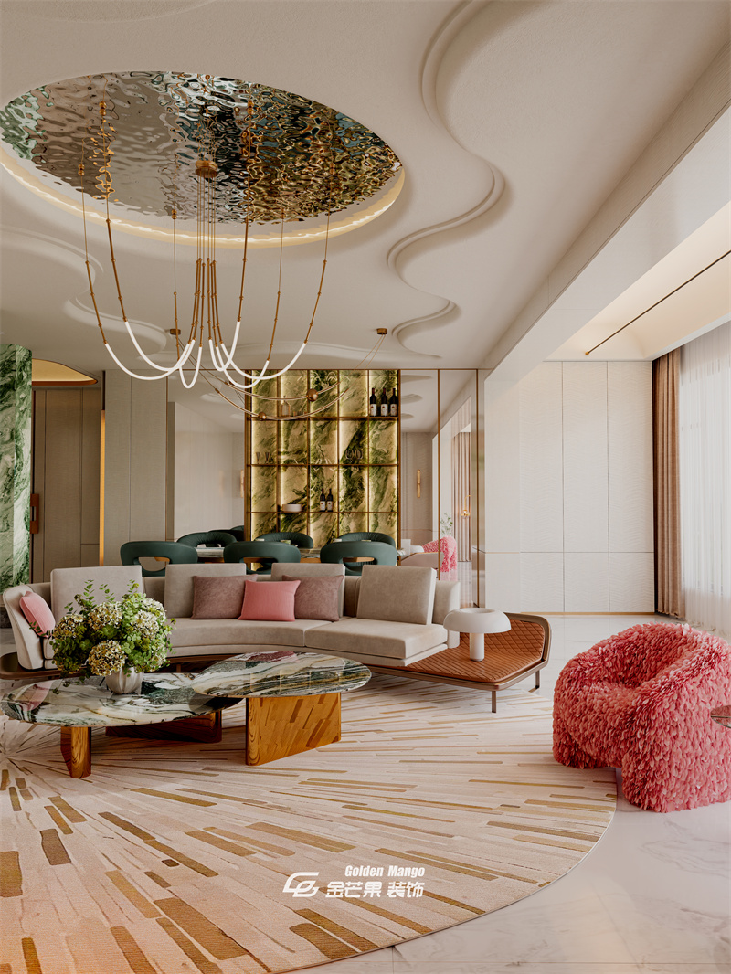 淺灰沙發(fā) + 粉色抱枕 + 毛絨單椅,柔和色調(diào)里藏著俏皮,圓形地毯的放射紋與吊頂呼應(yīng),讓空間更靈動(dòng)。
