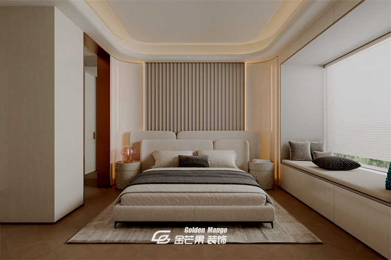 淺米色基底 + 暖調(diào)燈光,營(yíng)造出靜謐氛圍;床頭背景的豎向格柵軟包+ 弧形吊頂,柔化了空間線條。