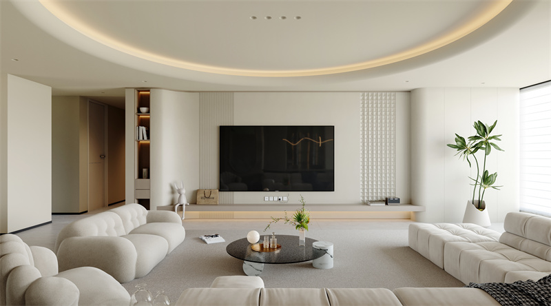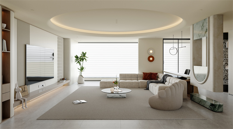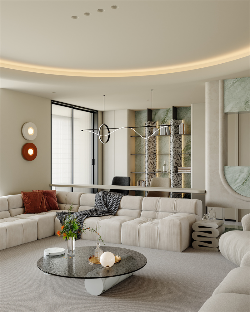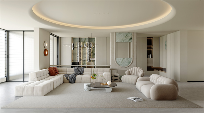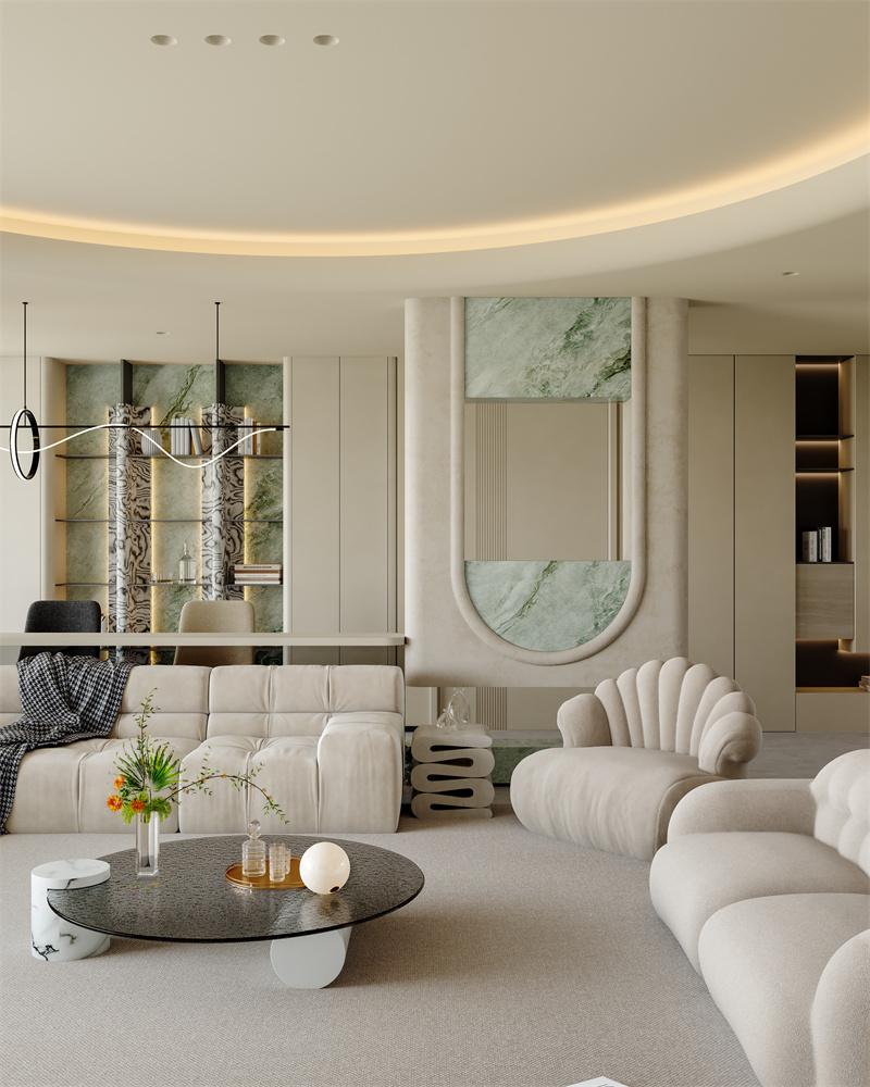 弧形吊頂藏著一圈光暈,像給空間蓋了層軟乎乎的 “被子”。L 型沙發(fā)是奶 fufu 的模塊式設(shè)計(jì),坐上去像陷進(jìn)蓬松的云朵里;旁邊那把貝殼造型的單人椅,連扶手都帶著圓潤(rùn)的弧度,隨手搭個(gè)格紋毯,慵懶感直接拉滿。