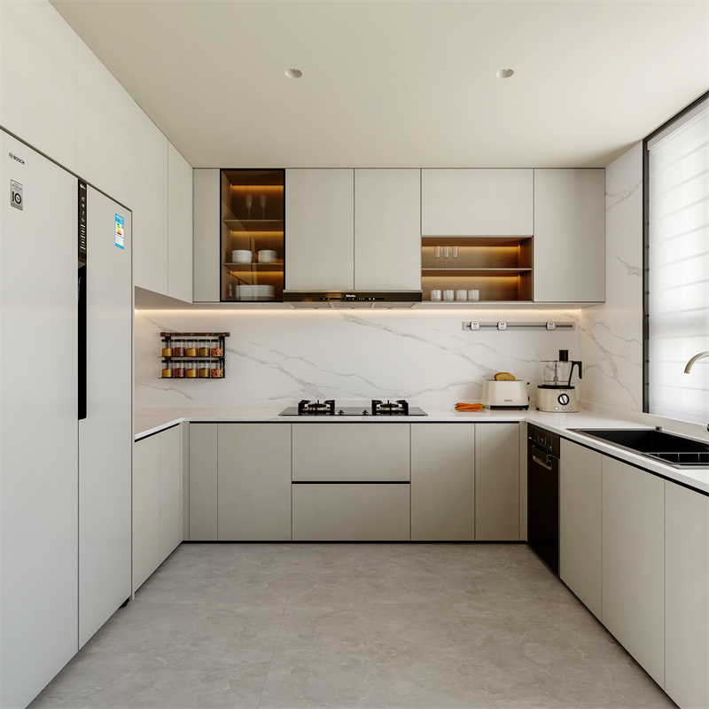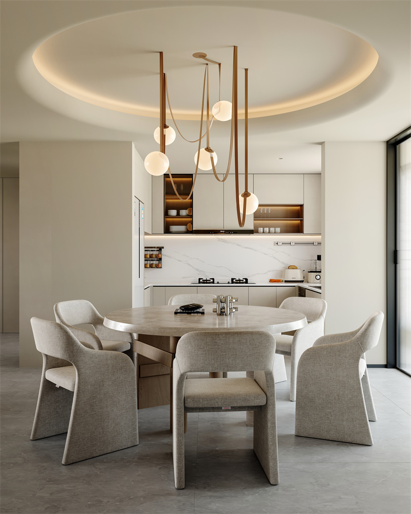 餐廳和廚房是 “無(wú)縫銜接” 的溫柔場(chǎng)。圓餐桌配著包裹感十足的布藝餐椅,頭頂?shù)那蛐蔚鯚粝駪抑鴰最w發(fā)光的奶糖;旁邊的開(kāi)放式廚房藏著小心思 —— 白色柜面襯著大理石紋墻磚,內(nèi)嵌柜里的暖光把餐具都照得溫柔,哪怕是洗個(gè)碗,都像在給生活做 “柔光濾鏡”。