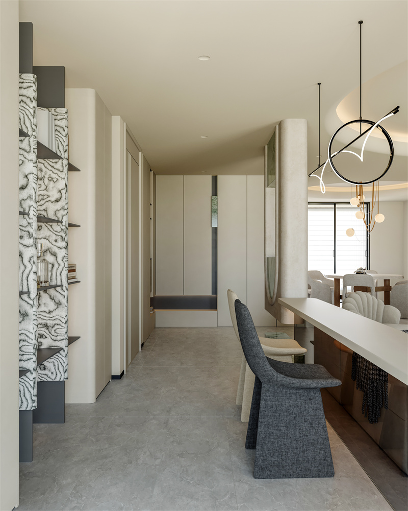 連過(guò)道都沒(méi)浪費(fèi):一側(cè)是帶紋理裝飾的展示架,另一側(cè)的吧臺(tái)既能臨時(shí)辦公,又能當(dāng)早餐臺(tái),抬眼就是餐廳的暖光,連獨(dú)處都不覺(jué)得冷清。
