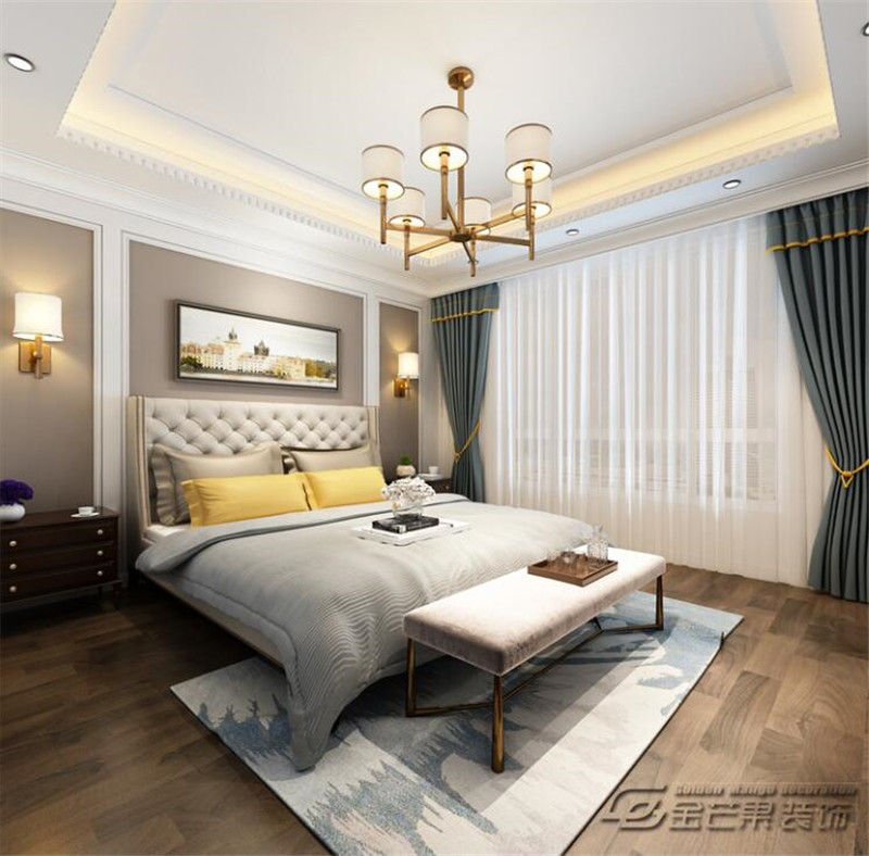 主臥的床頭背景色選擇了更加溫馨的卡其色,與地板的顏色相互襯托,再加上偏歐式的燈具和床品,整體給人的感覺就是大氣而又溫馨。