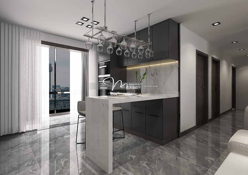 黑色的柜子搭配上乳白色的吧臺(tái)和滿目琳瑯的高腳杯,這也是一品酒中味的美妙,伴侶兩人幸福相擁的浪漫。