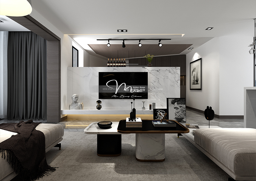 電視背景墻并沒有完全的隔離整個(gè)空間,使整空間得以延展。拋棄了主燈的設(shè)計(jì)用射燈加以代替,這更加符合整個(gè)主題。雕塑和畫像是極簡風(fēng)格的代表,也增加了藝術(shù)氛圍,也是主人追求精神生活的一大體現(xiàn)?;疑y理的地板磚顯得那么干凈、美觀。