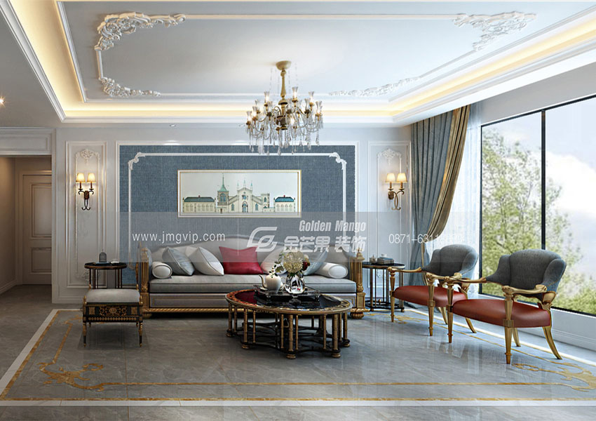 設計布局上沒有絲毫的掩飾,不論是大方的落地窗簾,還是頂上精美的雕花,亦或是晶瑩碧透的地磚等等,都在流露著豪華和優(yōu)雅。背景墻也和窗簾交相呼應。雕刻精細的沙發(fā)和椅子,高貴典雅。